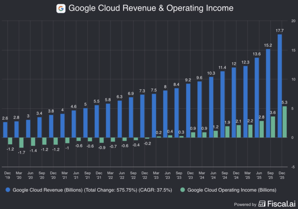 Den største positive overraskelse i regnskabet kom endnu engang fra Alphabets cloud-forretning. Google Cloud voksede 48 procent år over år og nåede en omsætning på 17,7 mia. USD i kvartalet. Endnu vigtigere er det, at Cloud nu leverer solid og skalerbar profitabilitet. Operating income i segmentet var 5,3 mia. USD, svarende til en margin på omkring 30 procent. Det markerer et tydeligt skifte i narrativet. Google Cloud er ikke længere en kapitaltung vækstcase, men en moden forretning, der kombinerer høj vækst med høj indtjening. Det matcher også billedet fra de seneste markedsdata, hvor cloud-væksten er den stærkeste i mere end fire år.